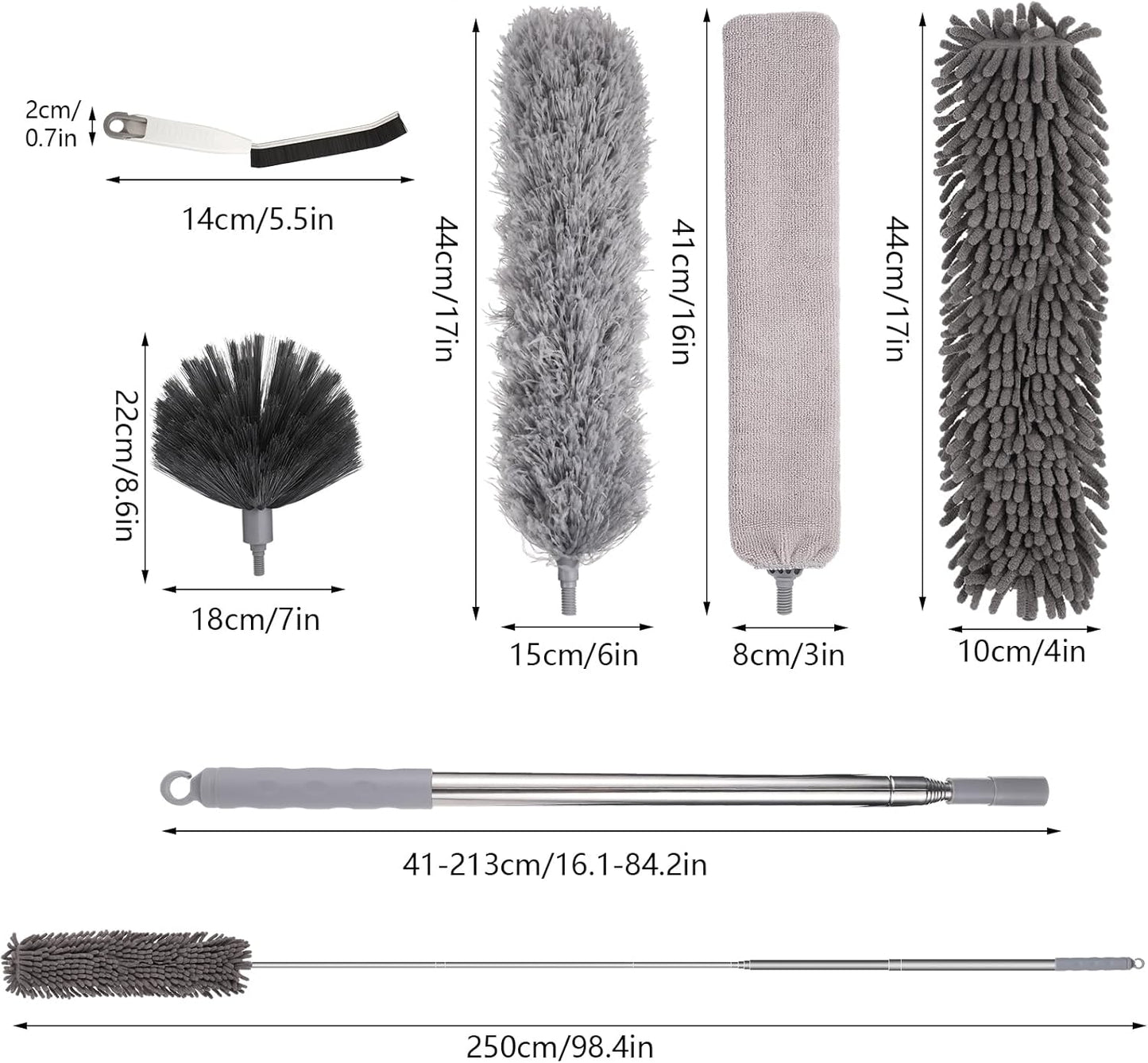 - 【7PCS Microfiber Cleaning Kit】Our feather duster kit inclued a extendable long pole with four replacement duster head,1*duster head,1*cobweb duster head,1*chenille duster head,1* duster head cloth,1*crevice cleaning brush,1*hook.This microfiber cleaning kit contains everything you need to clean your home or office from floors, windows, furniture to ceilings