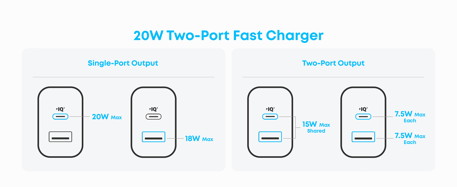 1. Single-Port Charging: USB-C: 5V⎓3A / 9V⎓2.22A / 12V⎓1.67A (20W Max) USB-A: 5V⎓3A / 9V⎓2A / 12V⎓1.5A (18W Max)