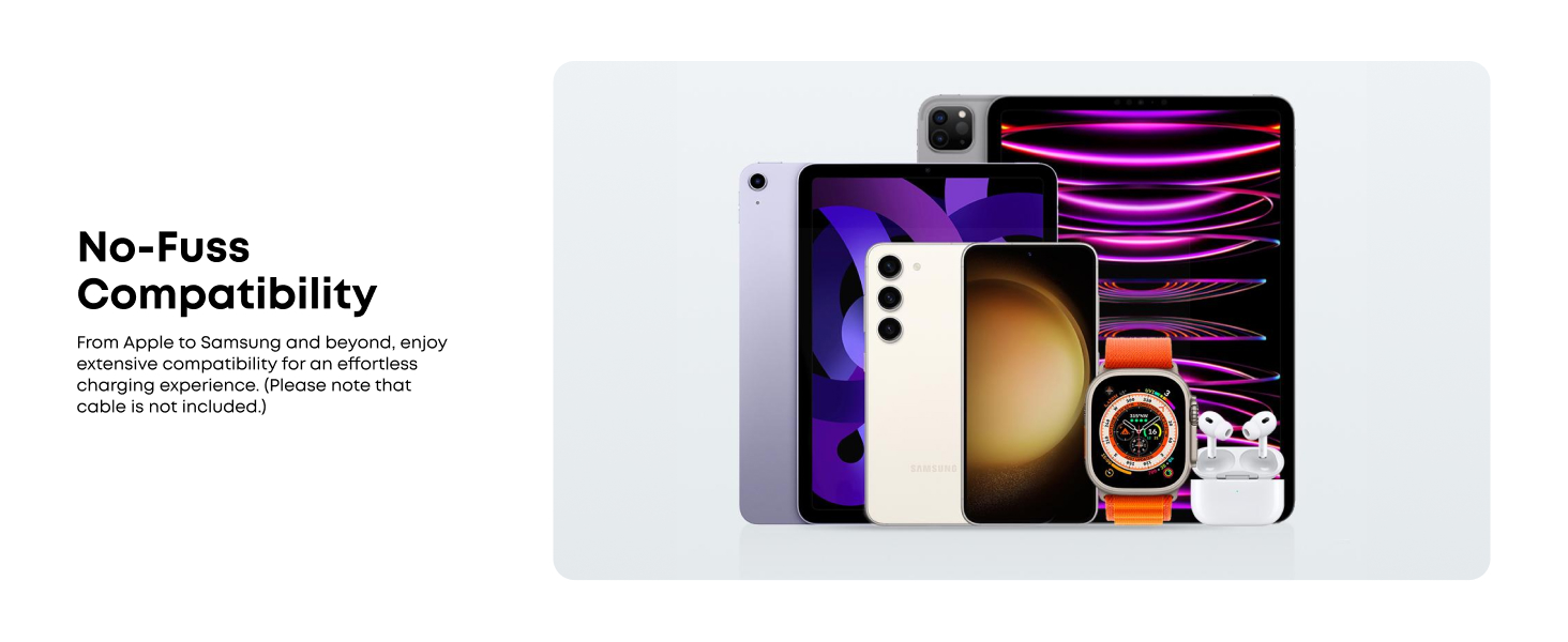 For devices with a USB-C port, use the included USB-C to USB-C cable. For devices with a Lightning port, you'll need a separate USB-C to Lightning or USB-A to Lightning cable. (Cables not included.)