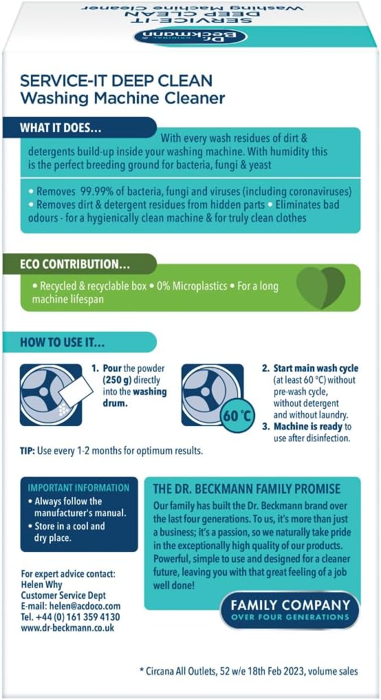 Dr. Beckmann service-it deep clean washing machine cleaner powder not only cleanses your machine but also kills 99.99 % of bacteria, viruses and fungi, leaving your washing machine hygienically clean and smelling fresh. Every time you wash deposits of dirt and detergent settle in your washing machine. This causes unpleasent damp smells and often mould on door seals and in detergent drawers. It is important to hygenically clean the the machine which helps you clean! Only a 'Deep Cleaned' washing machine can promise truly clean clothes. Use Dr. Beckmann's specially formulated Service-it Deep Clean washing machine cleaner to tackle the dirt and grime you can't see in your machine. The effective formula works best when used in conjunction with our original Service-it liquid for the dirt you can see. Both products should be used consecutively every two months or every 30 washes to ensure your machine is as clean as possible and continues to run smoothly and effectively. Directions for use: