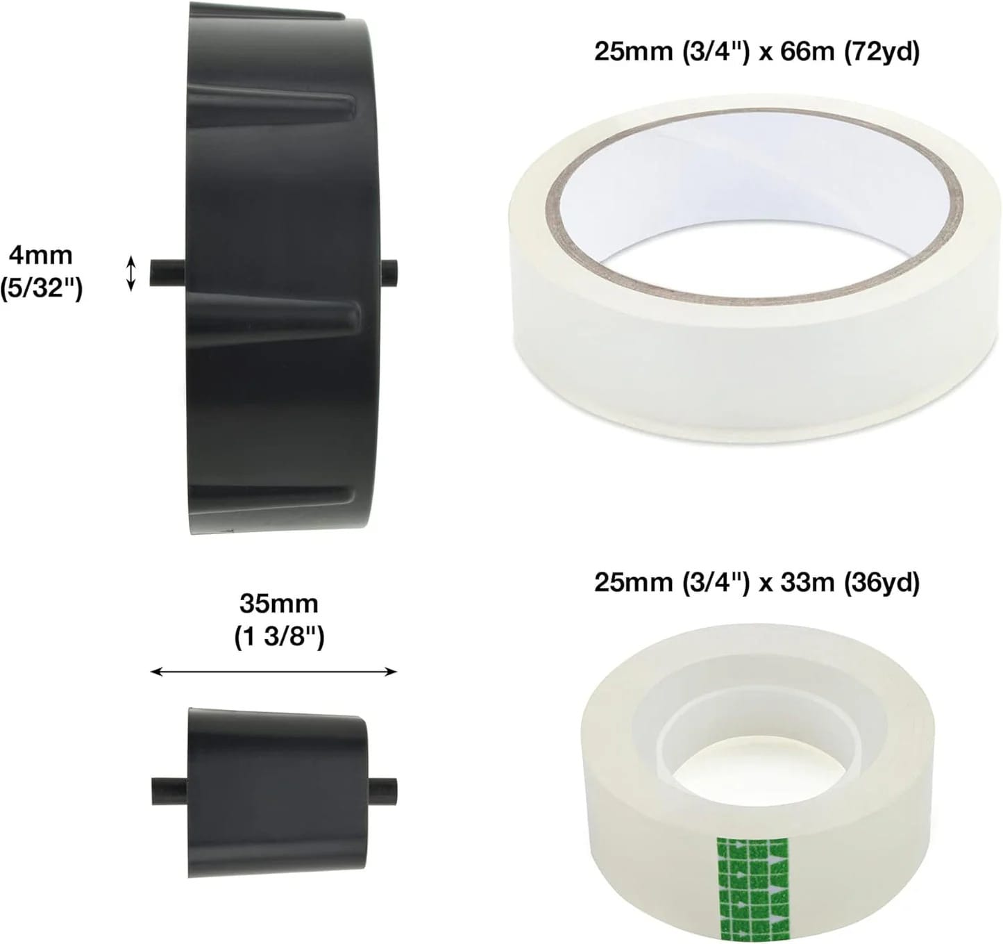 - COMPATIBLE WITH LARGE AND SMALL TAPES - Dual core facility allows use of both large and small tape rolls with 1" or 3" cores, accepts standard 33 m or 66 m tape reels with a 25 mm width
